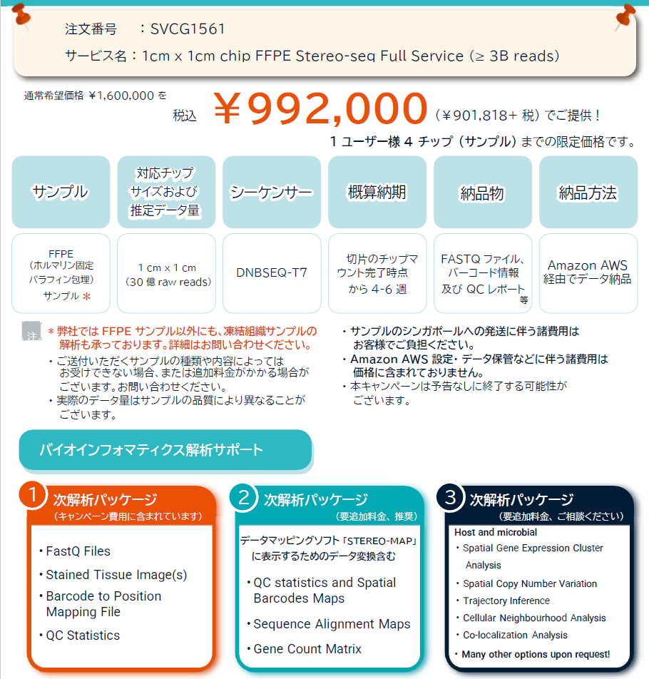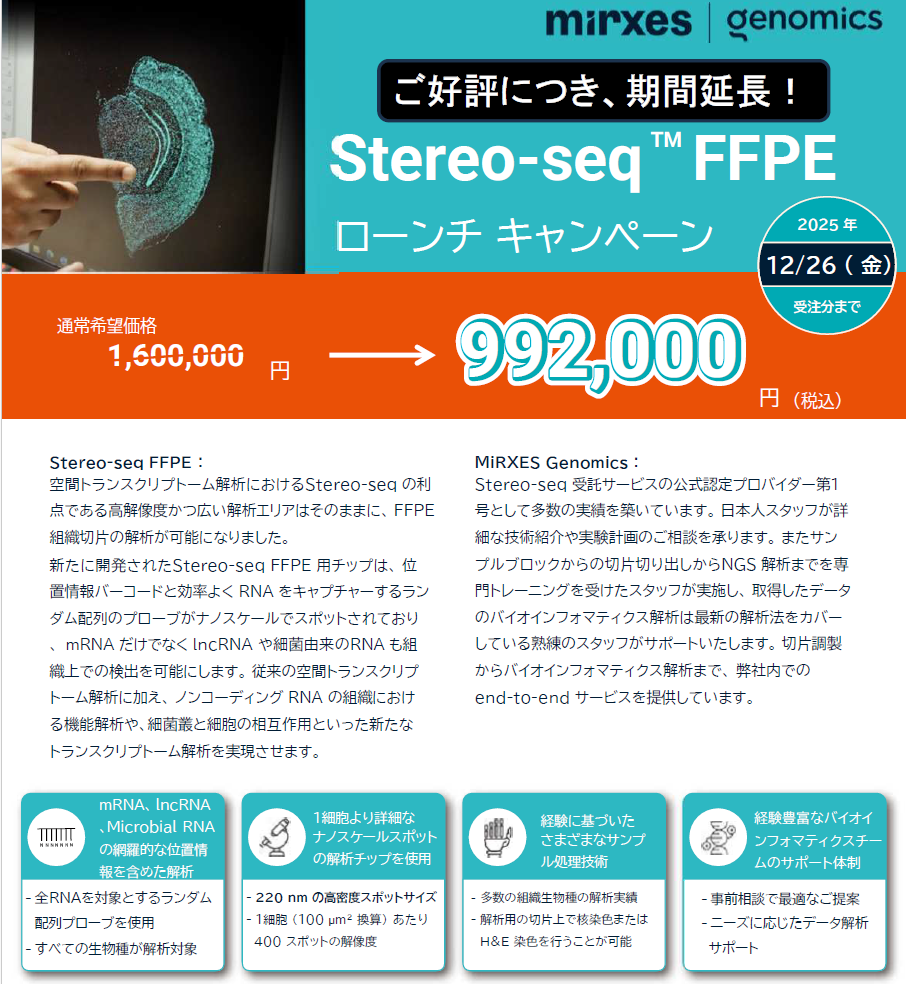 空間トランスクリプトーム解析 Stereo-seq FFPE 受託解析サービスのローンチキャンペーンを好評により期間を延長いたします。通常参考価格1,600,000円 をーーーー>キャンペーン価格992,000円(税込)でご提供!2025年12月26日申し込み分までの特別オファーです。このチャンスをお見逃しなく!